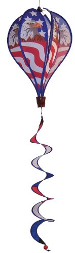 Patriot eagle animated kinetic hot air balloon hanging spinners have great visual appeal as they rotate in the wind. Enjoy color in motion as the heavy duty swivel lets them spin endlessly. The balloon is 16-inch high and has a 12-inch diameter. It comes with an attached 26-inch curlie tail.