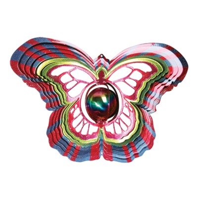This designer gazing ball butterfly wind spinner is made of 20 gauge steel and sparkling powder coated for durability and weather resistance, this beautiful design mesmerizes with two unique illusions in one for all to enjoy. A great item for decor outside as well as inside. A nice addition to any lawn or garden. It is eye-catching and it has pink, blue and green color. Measures 25 centimeter.